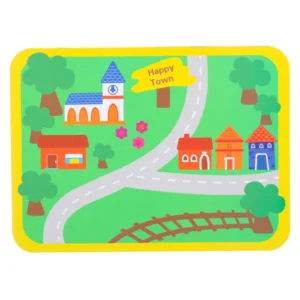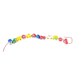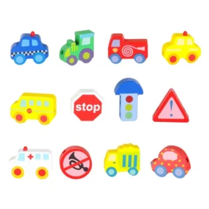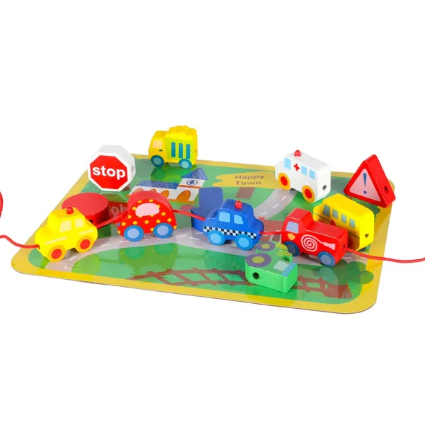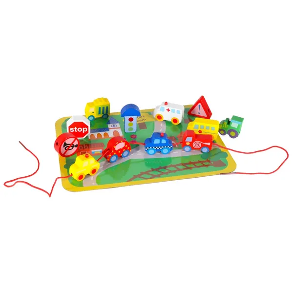 A 12 darab színes fa kockát a mellékelt zsinórra fűzve vagy a városi táblán elhelyezve a gyerekek játékosan fejlesztik finommotoros készségeiket, miközben a járművek és közlekedési táblák megismertetésével kreatív történeteket alkothatnak.