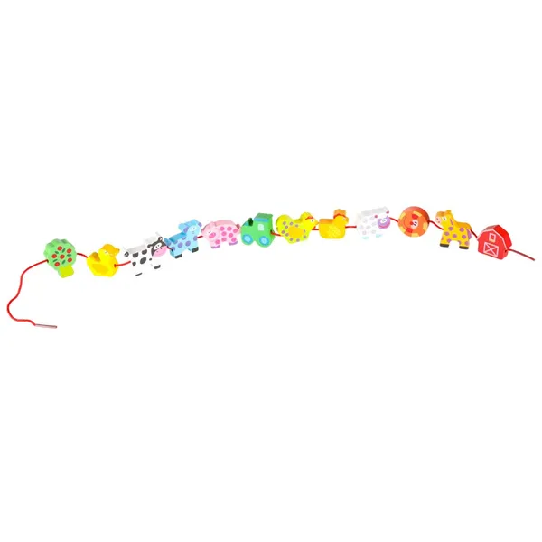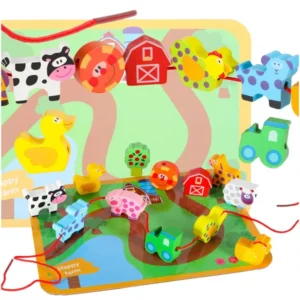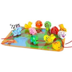 A festett fa elemek felfűzése és a farm táblán való elrendezése szórakoztatóan fejleszti a kézügyességet és a szem–kéz koordinációt. A könnyű, hordozható készlet kreatív történetmesélésre és nyugodt játékra ösztönzi a 3 évnél idősebb gyerekeket.