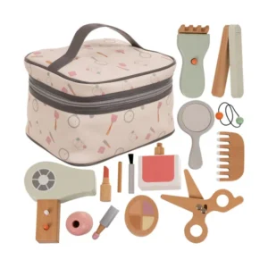Biztonságos, fa kiegészítőkkel készült, 17 darabos szépségszett, amellyel a gyerekek fodrászt és sminkest játszhatnak, miközben fejlődik a finommotorikájuk és az önbizalmuk. A praktikus tárolótáska segít rendet tartani, és utazáshoz is könnyen magatokkal vihető.