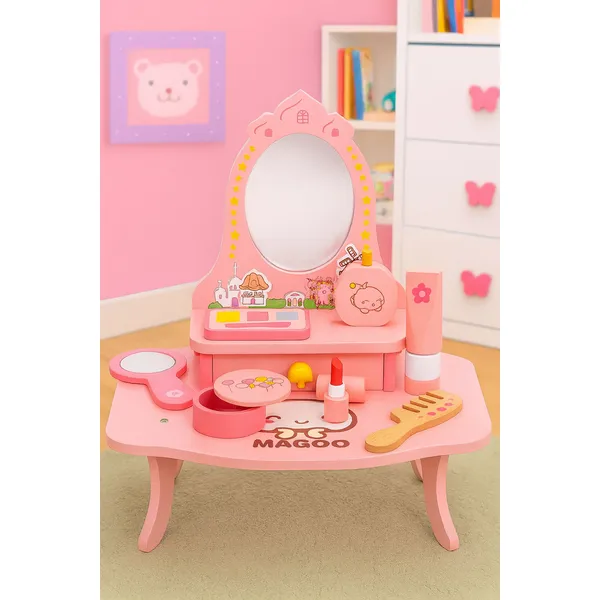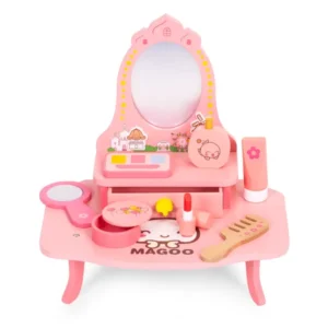 A fa pipereasztal igazi mesebeli sarokká varázsolja a gyerekszobát, ahol a kislányok biztonságosan utánozhatják a felnőttek szépségápolási rutinját. A lekerekített éleknek és a gondosan csiszolt felületeknek köszönhetően nincs sérülésveszély, a tömör fa szerkezet pedig tartós és környezetbarát.