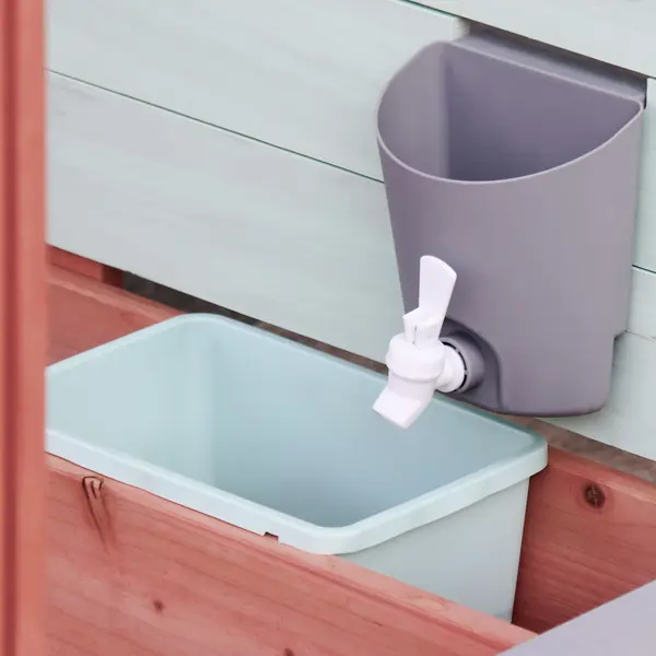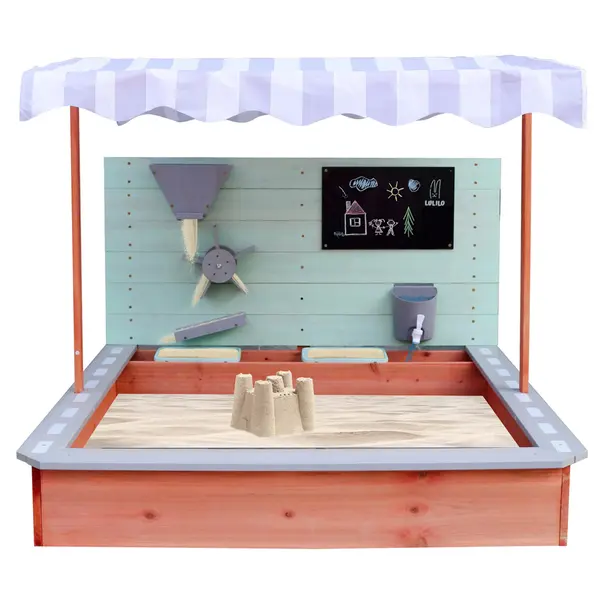 Kényelmes, 120×120 cm-es fa homokozó állítható, vízálló tetővel és padokkal, hogy a játék árnyékban is élvezetesebb legyen. A kréta tábla, homokmalom, csapos vizes tartály és a két eltolható tároló többféle kreatív játékot ad, miközben a tető segít tisztán tartani a homokot.