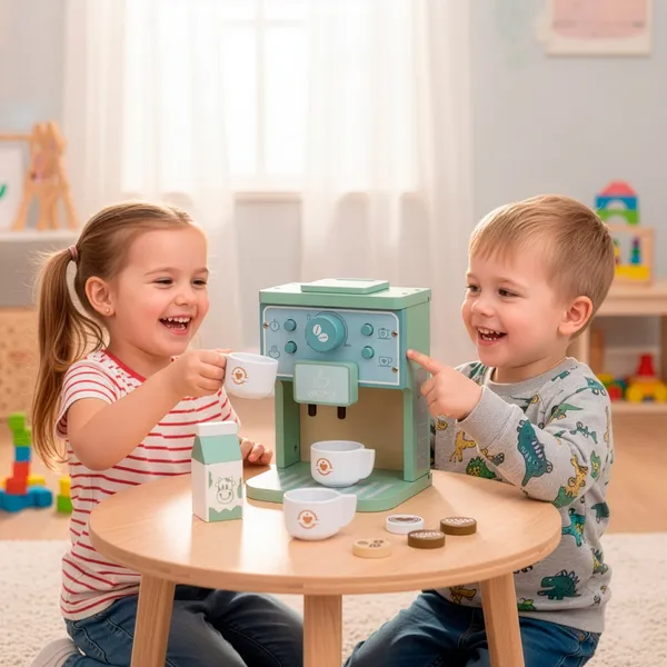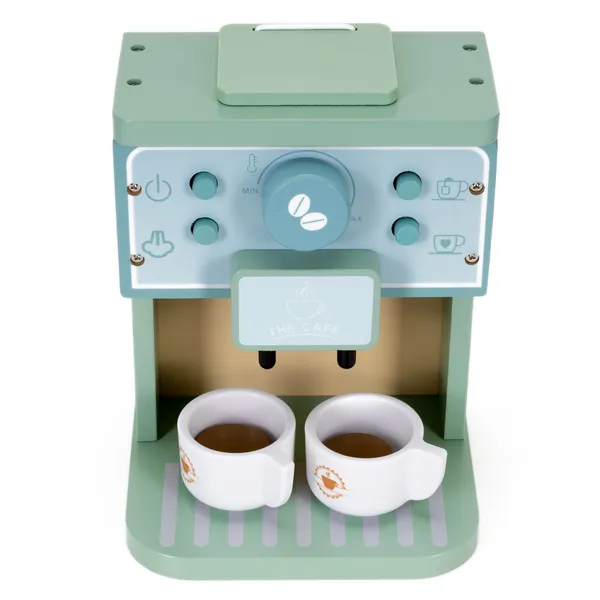 Természetes fából készült, 8 részes játék kávéfőző szett 3 éves kortól, amely segíti a szerepjátékot és a finommotorikát. A kattogó tekerőgomb és a kiegészítők (tej, csészék, zsetonok) élethű, biztonságos játékélményt adnak otthon.
