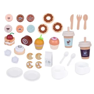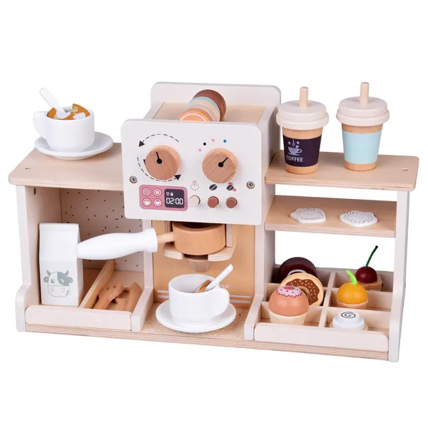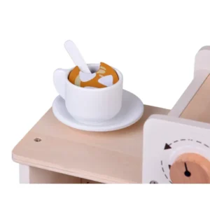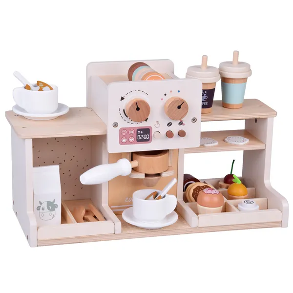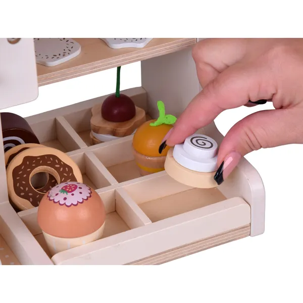 Valósághű fa kávézó játékszett mozgatható elemekkel és sok finom kiegészítővel, hogy a gyerekek kávét, teát és süteményeket „készítsenek” és felszolgáljanak. Tartós, szép kivitelű játék, amely támogatja a szerepjátékot, a finommotorikát és a társas készségek fejlődését.