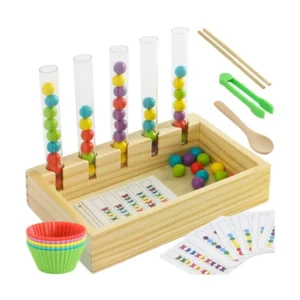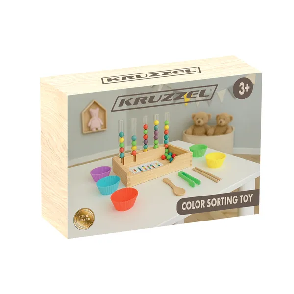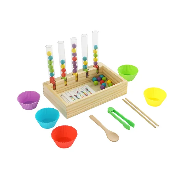Játékos módon tanítja a színeket és a számolást, miközben fejleszti a finommotorikát és a kéz–szem koordinációt. Strapabíró fa kialakítás és változatos kiegészítők (kártyák, csipesz, tálkák) segítik a koncentrációt és az önálló gyakorlást 3 éves kortól.