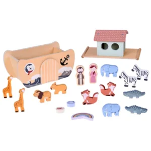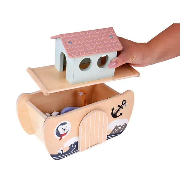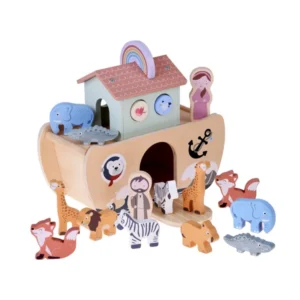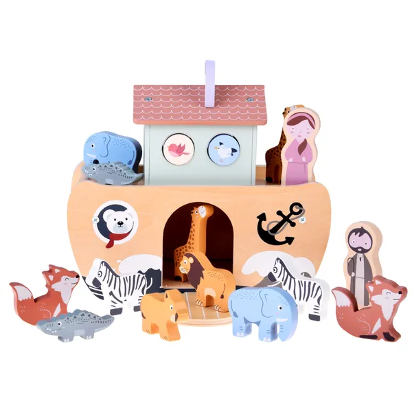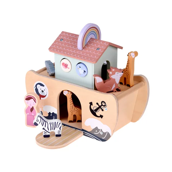 A pasztell színekben pompázó, masszív fa Noé bárka klasszikus formaillesztő és szerepjáték egyben, amely órákon át leköti a 3 + éves gyerekeket.