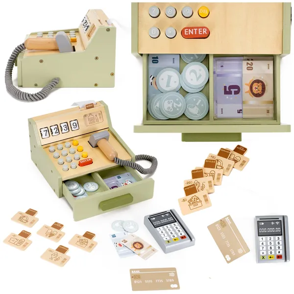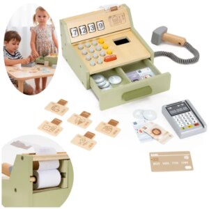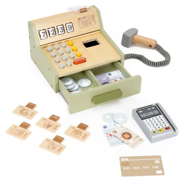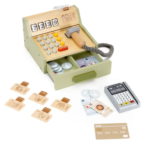 Természetes fából készült pénztárgép-szett boltosdihoz, kattintható gombokkal és „szkennerrel”, hogy a játék még életszerűbb legyen. A bankjegyekkel, zsetonokkal és kártyás terminállal fejleszti a számolást, a szerepjátékot és a finommotorikát 3 éves kortól.