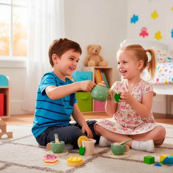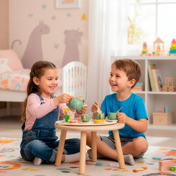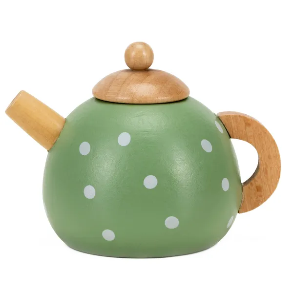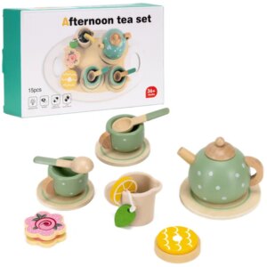 Fa reggeli teakészlet – klasszikus szerepjáték-kiegészítő, amellyel a gyerekek saját „teázós” vagy reggelizős jeleneteket játszhatnak el. A természetes fa és a vidám, pasztelles színek otthonos hangulatot teremtenek, miközben a játék támogatja a kreatív történetmesélést és a finommotorikát.