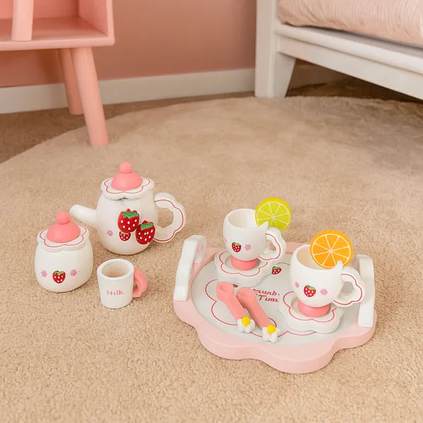 Ez a bájos, eper motívumos fa teaszerviz 14 gondosan megmunkált elemből áll, hogy a kicsik élethűen utánozhassák a délutáni teázást.