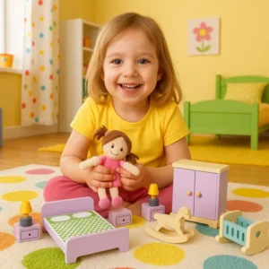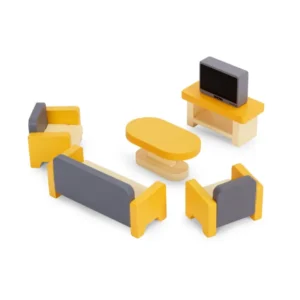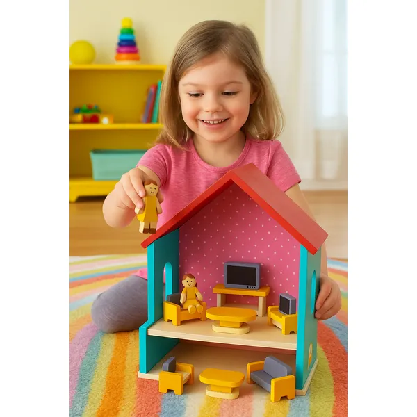 30 darab gondosan kidolgozott fa bútordarab, amelyekkel a gyerekek teljes babaházat rendezhetnek be, miközben fejlődik a kreativitásuk és finommotorikájuk. Lekerekített élek és tartós kialakítás garantálja a biztonságot és a hosszú élettartamot.