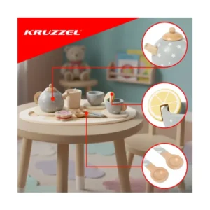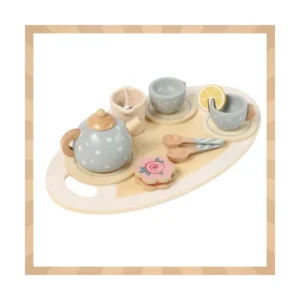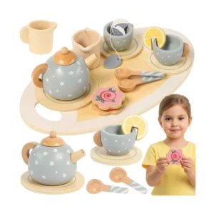 Valósághű fa teaszett szép, szürke dizájnnal, amellyel a gyerekek imádják eljátszani a teadélutánt és a vendéglátást. A csészék, kancsó és tálca használata közben fejlődik a finommotorika, a szem–kéz koordináció és a társas készségek; 3 éves kortól ideális ajándék.