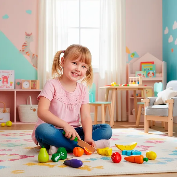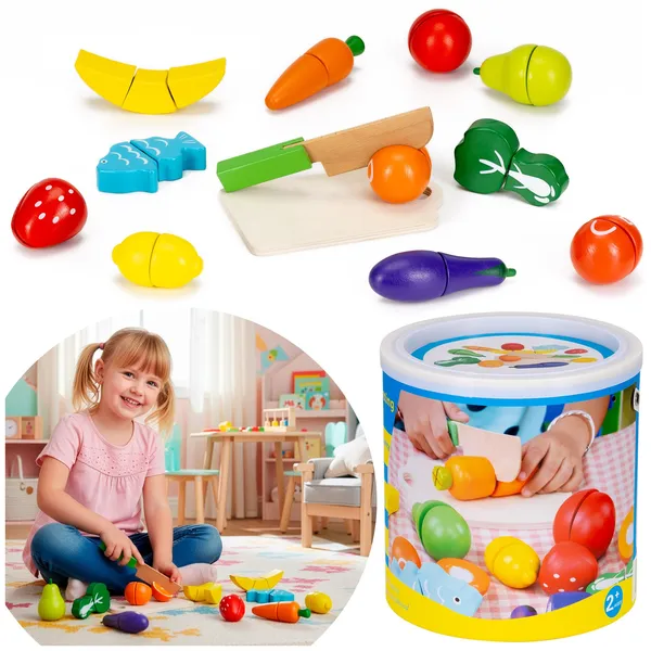 Vágható, tépőzáras fa gyümölcsök és zöldségek valósághű „szeletelős” hanggal, hogy a szerepjáték még izgalmasabb legyen. A fogantyús tárolóedényben könnyen elpakolható, miközben fejleszti a finommotorikát és a kéz–szem koordinációt 3 éves kortól.