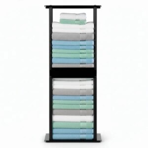 Praktikus, helytakarékos megoldás a fürdőszobába: a fali törölközőtartó két polccal segít rendszerezni a törölközőket és a mindennapi kiegészítőket. A matt fekete fém kivitel modern megjelenést ad, a falra szerelhető kialakítás pedig szabadon hagyja a padlót, így könnyebb a takarítás.