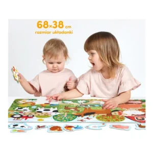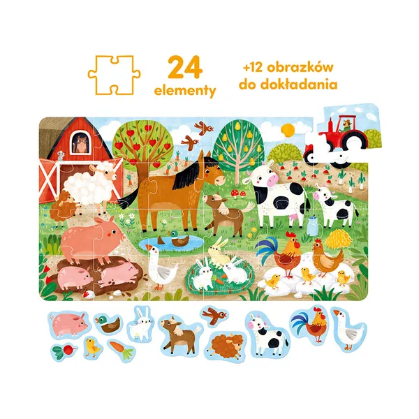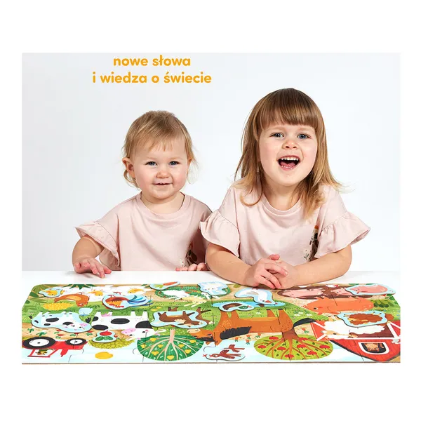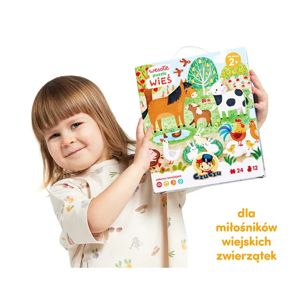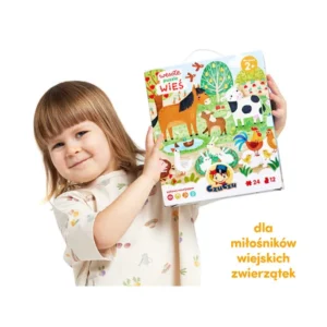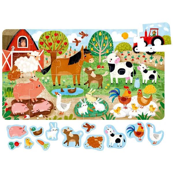 Színes, vidám kirakónkkal a legkisebbek is felfedezhetik a falusi udvar állatait, miközben fejlődik a finommotorikájuk és a megfigyelőképességük. A 24 darabból álló, 68×38 cm-es óriás puzzle elkészültével egy részletgazdag tanyasi jelenet tárul fel, amelyhez 12 külön kártya is tartozik további játékötletekhez.