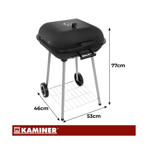 A fedeles kialakítás segít egyenletes hőfokon sütni és kevesebb odafigyeléssel finomabb eredményt elérni. A kerekekkel könnyen mozgatható, az alsó polc pedig praktikus helyet ad a szénnek és a kiegészítőknek, így rendezettebb és kényelmesebb a kerti grillezés.