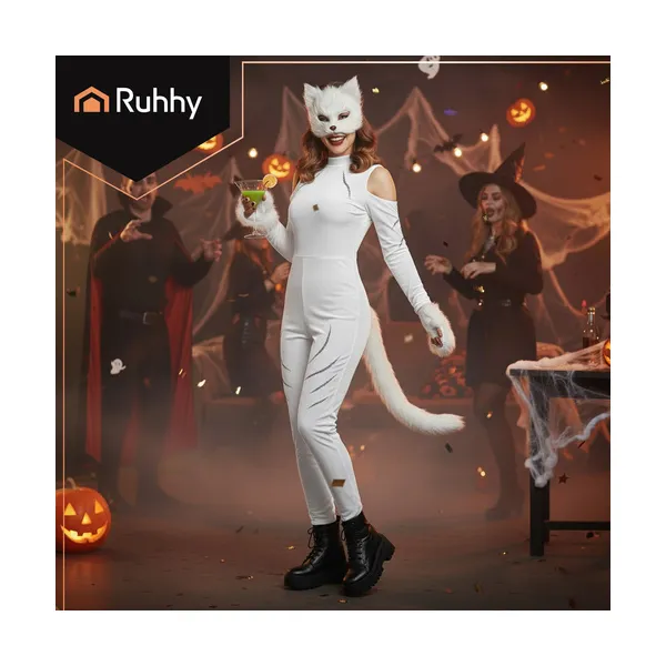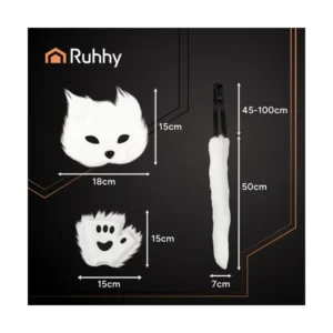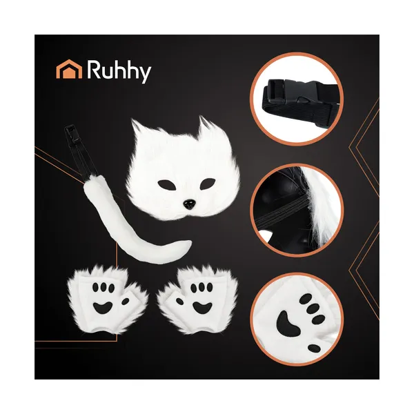 Ez a fehér, 4 az 1-ben macska/róka/farkas jelmez kiegészítő szett látványos és kényelmes választás cosplayhez, bulikhoz, fotózáshoz vagy tartalomgyártáshoz. A puha műszőrme kellemes tapintású, a maszk rugalmas pánttal stabilan illeszkedik, a hosszú farok pedig állítható rögzítéssel kényelmesen hordható. A farokban lévő hajlítható drót segítségével formára igazíthatod a megjelenést, a kesztyűszerű mancsok pedig azonnal „karaktert” adnak az outfitednek.