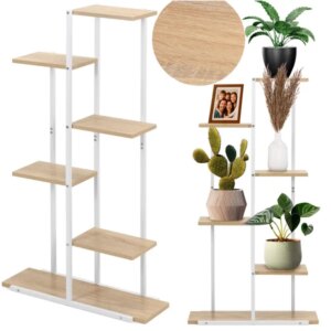 Hat polcával elegánsan lépcsőzetes elrendezést kínál, így minden növény elég fényt kap, jól szellőzik, és a természetes tölgyhatású felületek vonzó hátteret adnak a zöldnek. Karcsú formája kis helyen is elfér, mégis 40 kg-ig teherbíró; csúszásmentes talpai óvják a padlót, a könnyen tisztítható polcok tartósak, a szükséges szerelési tartozékokat pedig a csomag tartalmazza.