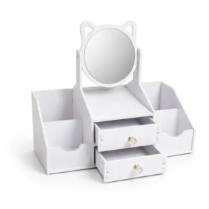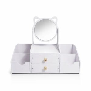 Ez a kis sminkasztal formájú ékszer- és kozmetikai rendszerező praktikus megoldást kínál a mindennap használt kiegészítők tárolására. A kerek tükör megkönnyíti a készülődést, míg a kompakt kialakításnak köszönhetően könnyen elhelyezhető íróasztalon, komódon vagy fésülködőasztalon.