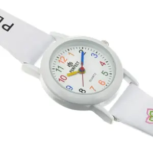 A fehér tok és a hozzá illő puha szíj könnyű, kényelmes viseletet biztosít a gyermek csuklóján. A klasszikus csat egyszerű méretállítást tesz lehetővé, ami különösen praktikus növésben lévő gyerekeknél. Az óra egész nap kényelmesen hordható játék, tanulás vagy családi programok során is.