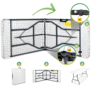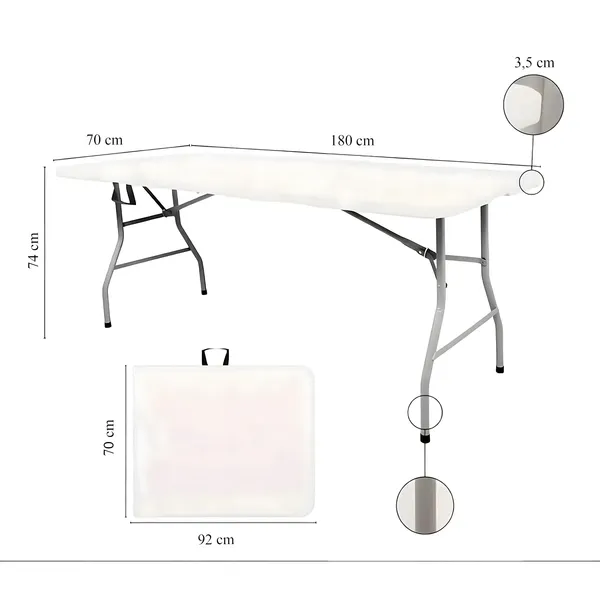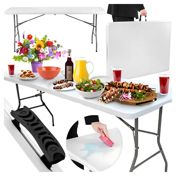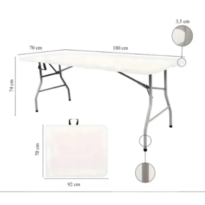 Ez a 180×70×74 cm-es, fehér összecsukható asztal ideális kerti partikhoz, cateringhez és bankettekhez. A masszív szerkezetnek köszönhetően egyszerre tágas és stabil, mégis pillanatok alatt bőrönddé alakítható, így a szállítása és tárolása gyerekjáték.