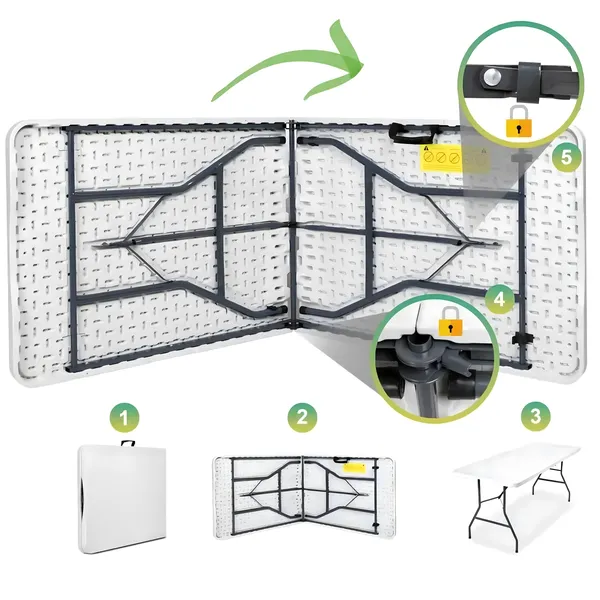 Nagy, mégis könnyen hordozható asztal, amely bőröndméretre csukható, így egyszerűen tárolhatod és szállíthatod, akár a csomagtartóban is. Strapabíró műanyag lapja és acéllábai stabil alapot adnak grillpartikhoz, vásárokhoz vagy családi ebédekhez, egyetlen törléssel ragyogóan tisztára törölhetők, így az asztal mindig készen áll a vendégek fogadására.