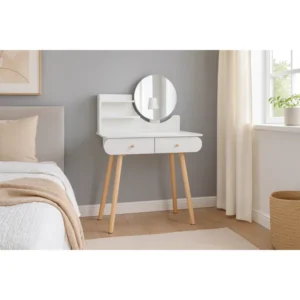 A két fiók és nyitott polcok átlátható, rendezettséget biztosító tárolóhelyet adnak minden kozmetikumodnak, ékszerednek és kiegészítődnek, tökéletesen megalapozva a nyugodt rutinokat. A kerek tükörrel ellátott, skandináv stílusú bútor elegáns megjelenést kölcsönöz a hálószobádnak, miközben ergonomikus magassága miatt kényelmes felkészülést kínál minden reggel és este.