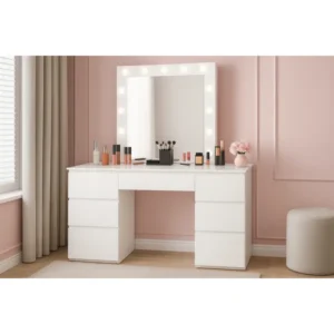 A nagyméretű, LED-világítású tükörrel és hét tágas fiókkal ellátott sminkasztal professzionális fényt, rendezett tárolást és elegáns megjelenést nyújt, így a sminkelés gyorsabb, pontosabb és élvezetesebb.