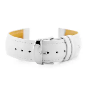 Fehér színű, természetes bőrből készült óraszíj fehér varrással. Az ezüstszínű fém csat elegáns megjelenést ad, így kiváló választás lehet a mindennapi viselethez és alkalmi használatra is.