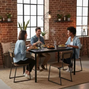 Sokoldalú, modern kialakítású asztal, amely egyaránt megállja a helyét étkezőasztalként, konyhai munkafelületként vagy otthoni íróasztalként. 120×60 cm-es mérete elegendő teret ad 4–5 személy kényelmes étkezéséhez vagy produktív munkájához.