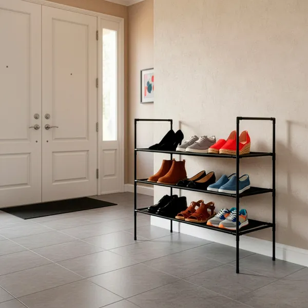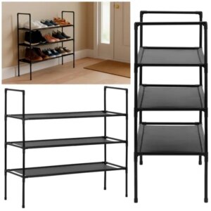 Praktikus cipőtartó állvány rendezett előszobához: a 3 polcos kialakítás segít áttekinthetően tárolni a cipőket, miközben a fém váz stabil tartást ad. A fekete szín letisztult, könnyen illeszkedik a legtöbb enteriőrbe.