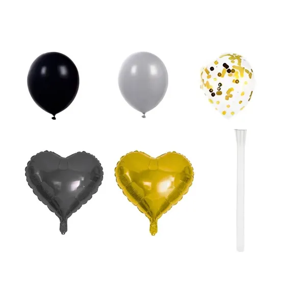 Stílusos fekete–arany lufi szett, amellyel percek alatt látványos dekorációt készíthetsz születésnapra vagy ünnepi alkalmakra. Az arany konfettis áttetsző lufik és a szív alakú darabok különleges fotóháttért és elegáns hangulatot adnak a bulinak.