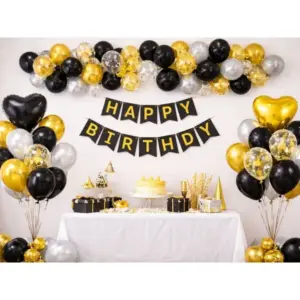 Elegáns fekete–arany–ezüst lufi szett, amellyel gyorsan látványos parti dekorációt készíthetsz születésnapra és különleges alkalmakra. A fekete lufik modern, ünnepi hangulatot adnak, a csillogó arany konfetti pedig azonnal feldobja a teret.