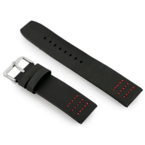 Természetes bőrből készült, fekete kivitelű óraszíj piros varrással és ezüstszínű csattal, amely egyszerre elegáns és karakteres megjelenést ad az órának. A 24 mm-es szélesség és a több állítási lehetőség kényelmes, biztos illeszkedést nyújt a mindennapokban.