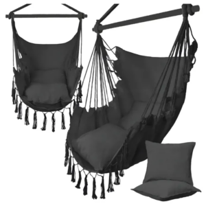 Engedd, hogy a lágy ringatózás elrepítsen a nyugalom világába ezzel a fekete, párnákkal ellátott brazil függőfotellel, amely tökéletes társ a nappaliban, a kertben vagy akár utazáskor.