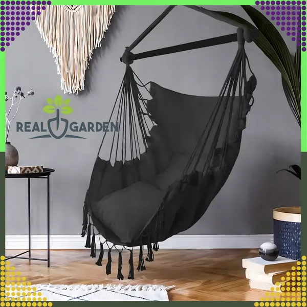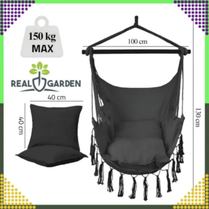 Ringatózz a puha párnák között ebben a fekete brazil függőfotelben, amely 150 kg-ig biztonságosan tart és pillanatok alatt felszerelhető beltéren vagy a szabadban. A tartós, légáteresztő anyag és a stabil fa keresztrúd gondoskodik a hosszú élettartamról és a maximális kényelemről.