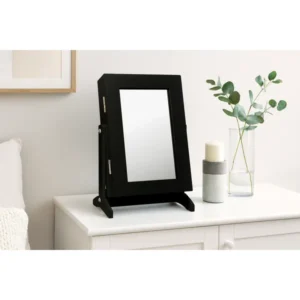 Elegáns, fekete ékszertároló szekrény, amely egy teljes méretű tükörrel és puha plüss béléssel óvja ékszereidet a karcolódástól. Kompakt 21×15×35 cm-es méretének köszönhetően könnyedén elfér az éjjeliszekrényen, komódon vagy a gardrób polcán.