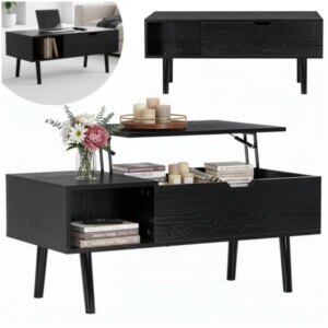 Praktikus, modern dohányzóasztal emelhető és előretolható asztallappal, amely kényelmes megoldás nappaliba: gyorsan átalakítható „kanapé melletti” munka- vagy étkezőfelületté, miközben a belső tároló és a nyitott polcok segítenek rendet tartani.