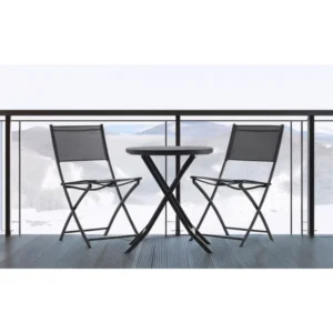Fekete erkély bútorszett: kerek üvegasztal + 2 összecsukható szék