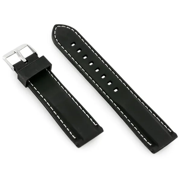 A 22 mm-es, fekete-fehér gumióraszíj víz- és izzadságálló, rugalmas anyagának köszönhetően sportoláshoz is ideális. Ezüstszínű csatja biztonságosan zár, a 8 lyuk pedig pontos illeszkedést ad mindennapi kényelem mellett.