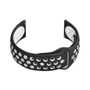 Kényelmes, rugalmas gumiszíj sportos fekete külsővel és fehér belső oldallal, amely egész nap jól viselhető. A gyorskioldós kialakításnak köszönhetően a csere egyszerű, az ezüstszínű csat pedig biztos tartást ad.
