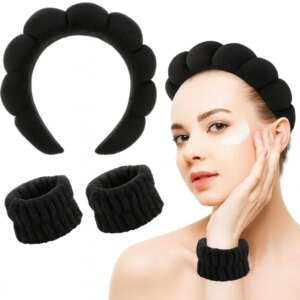 Fekete fejpánt és csuklópánt készlet arcápoláshoz, puha, univerzális