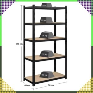 Masszív, porszórt acélból készült állvány, amely ideális garázsba, műhelybe, raktárba vagy pincébe. A 180 cm magas, 90 cm széles és 40 cm mély polcrendszer 5 darab, MDF felületű polclappal rendelkezik, amelyek egyenként akár 175 kg terhet is elbírnak, így a teljes teherbírás eléri a 875 kg-ot.