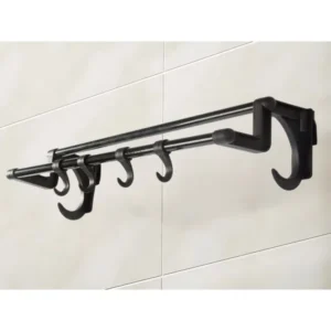 Erős öntapadós törölközőtartó, amely 40 cm-es rúdjával és 4 kampójával rendszerezi a törölközőket, anélkül hogy lyukat fúrna a csempébe. Rozsdamentes fekete fém kivitel, elegáns megjelenéssel és egyszerű 3 lépéses telepítéssel.