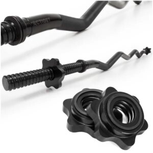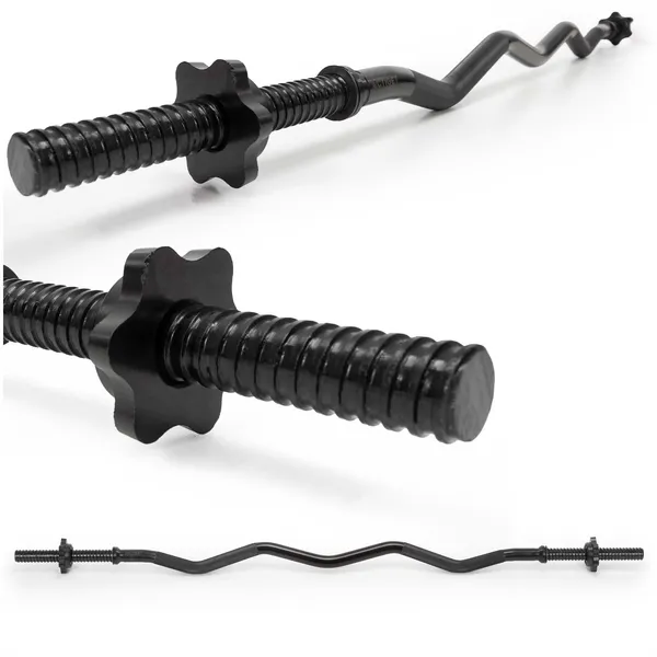 Ergonomikus, hajlított SZ rúd a kényelmesebb csuklótartásért és célzottabb bicepsz/tricepsz edzéshez. A krómozott acél kialakítás, a csúszásmentes fogás és a menetes szorítók gumialátétekkel stabilan a helyén tartják a tárcsákat edzés közben.