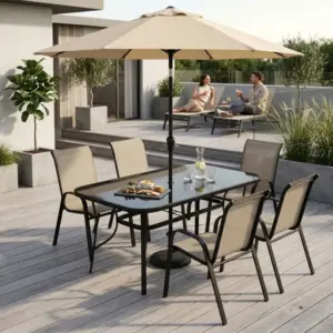 Stabil, időjárásálló kerti asztal tágas, edzett üveglappal, amely kényelmes helyet ad étkezésekhez és vendéglátáshoz a teraszon vagy a kertben. A 4,5 cm-es napernyőnyílással egyszerűen kialakítható árnyékos pihenőhely, a felület pedig könnyen tisztán tartható.