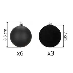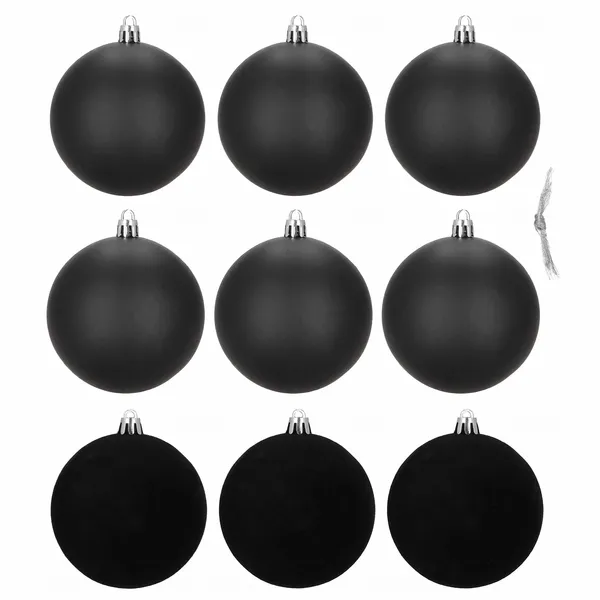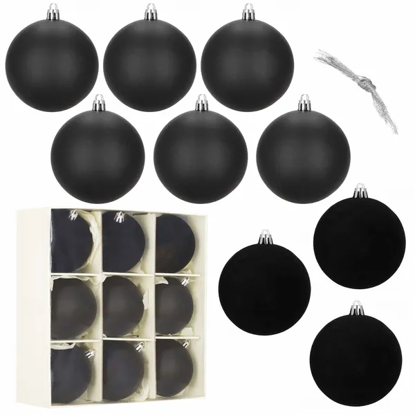 Törhetetlen, fekete gömbdísz szett félmatt és velúrhatású felülettel, hogy a karácsonyfád egységesen elegáns legyen. A csomagban 9 darab dísz és ingyenes akasztózsinórok vannak, így gyorsan és biztonságosan feltehetők.