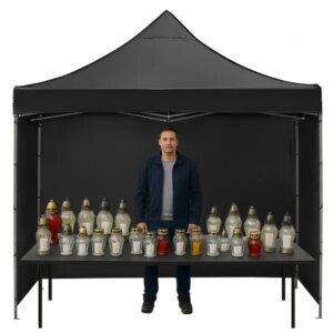 Perc alatt felállítható, 3×3 m-es pavilon vízlepergető Oxford 420D tetővel és stabil acélvázzal, amely hatékonyan óvja a vendégeket a napsütéstől és az enyhe esőtől. Hordtáskába csomagolható, így könnyen szállítható rendezvényről rendezvényre.