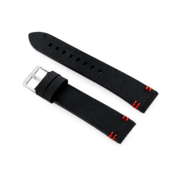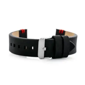 Természetes bőrből készült óraszíj fekete színben, dekoratív piros varrással. Az elegáns megjelenést ezüstszínű fémcsat egészíti ki, amely klasszikus és sportos órákhoz is jól illik.