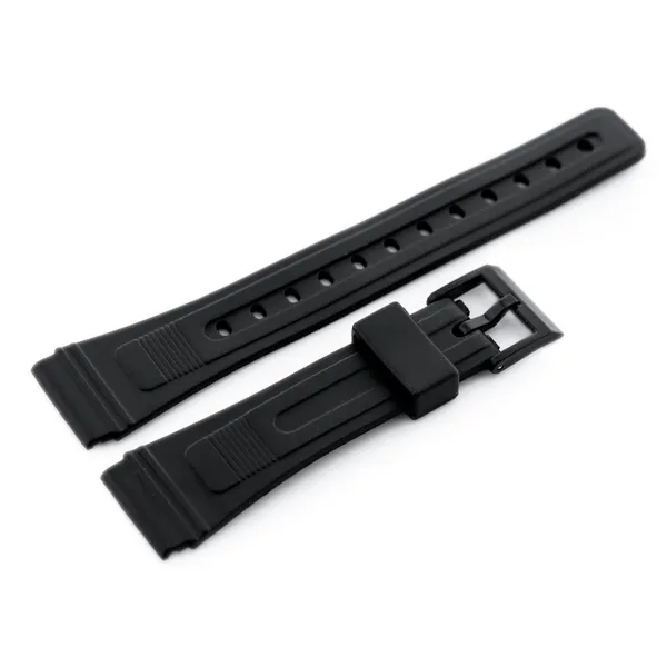 Praktikus, fekete színű PVC gumi óraszíj mindennapi használatra. Rugalmas, könnyen tisztítható anyaga kényelmes viseletet ad, sportos és hétköznapi órákhoz is jól illik.