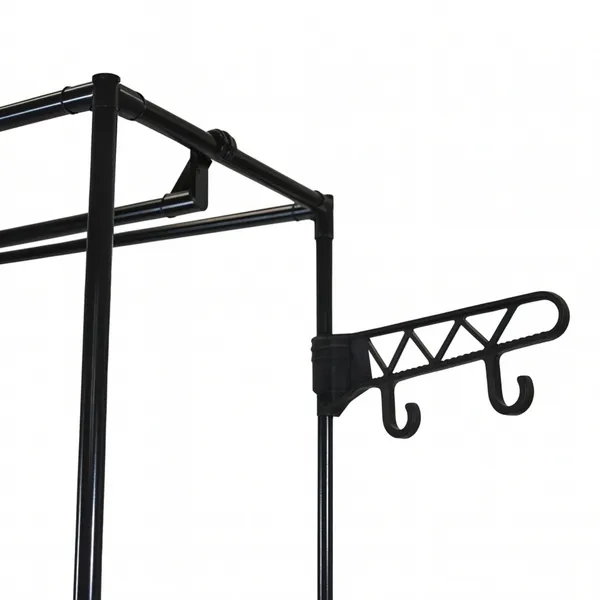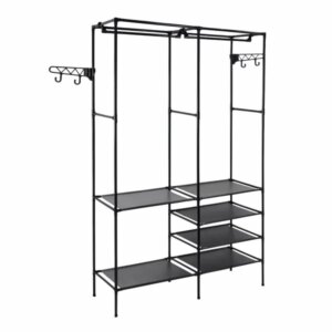 A fekete ruhatartó állvány polcokkal praktikus és esztétikus megoldás a ruhák rendezett tárolására otthon, irodában vagy gardróbban. A porfestett acél váz stabil tartást és hosszú élettartamot biztosít, a poliészter nemszőtt polcok pedig kényelmes helyet adnak kiegészítőknek és könnyebb ruhadaraboknak. A kialakítás a helykihasználásra fókuszál: külön, magasabb rész áll rendelkezésre kabátoknak, alul pedig anyaggal fedett polcok segítenek a por elleni védelemben.