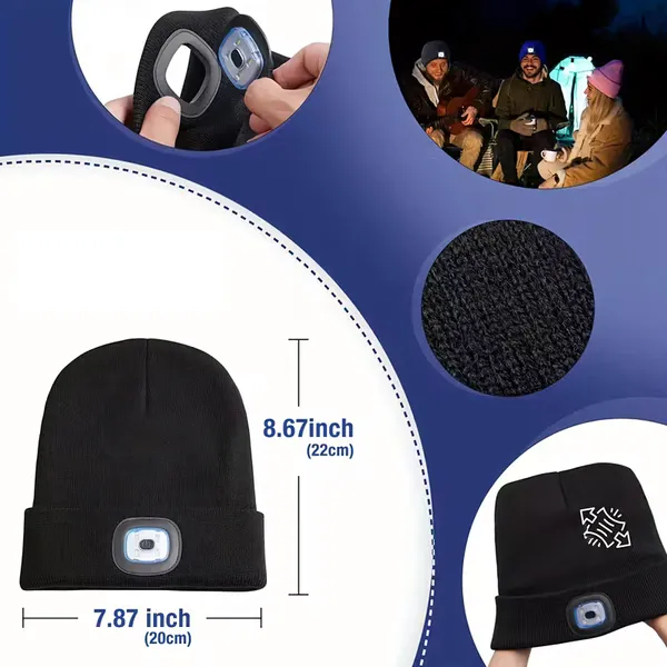 Fekete téli sapka kivehető LED lámpával, 3 fény­móddal
